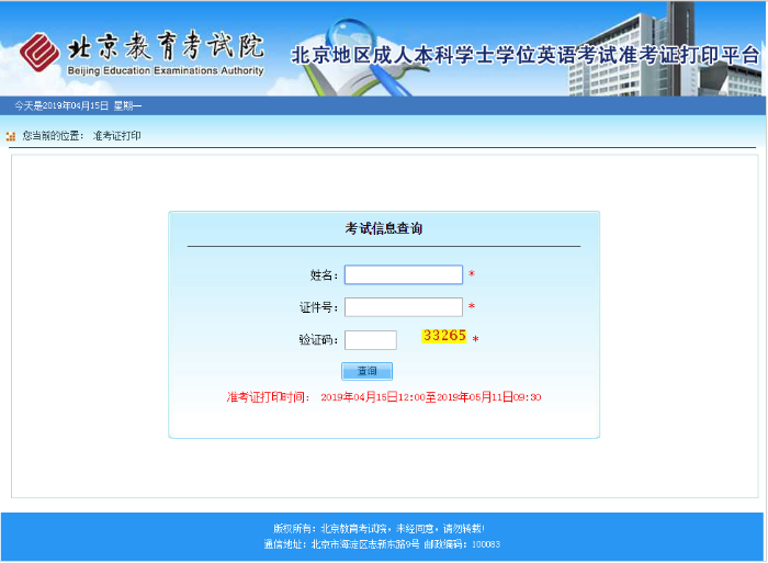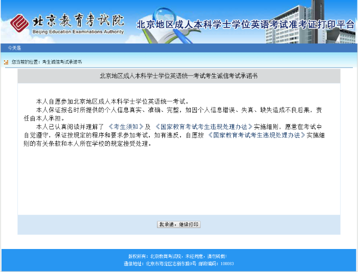 准考证打印方法:登录北京教育考试院网站www.bjeea.cn,直接点击“公告栏”下“北京市成人本科学士学位英语考试准考证打印”,进入准考证打印平台: