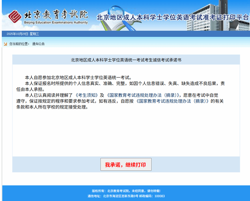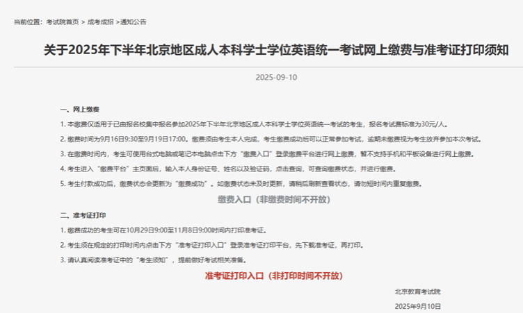 准考证打印方法:登录北京教育考试院网站 https://www.bjeea.cn/html/ckcz/tzgg/2025/0910/87295.html,直接点击“通知公告”下 “关于2025年下半年北京地区成人本科学士学位英语统一考试网上缴费与准考证打印须知”进入准考证打印入口: