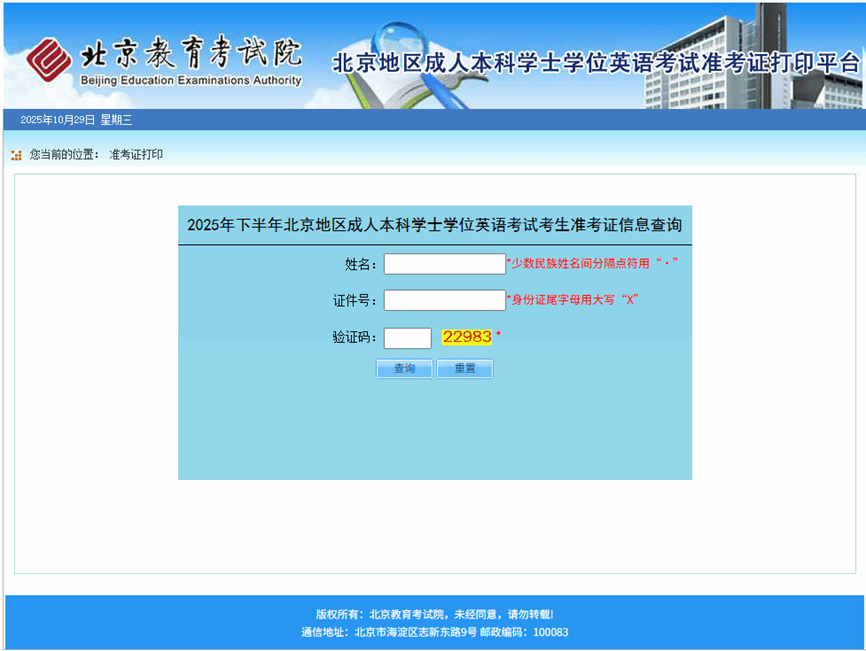按照北京教育考试院考试要求,2025年11月8日(周六)北京成人本科学士学位英语统一考试由考生自行在网上打印准考证,打印时间为10月29日9:00至11月8日9:00。请考生认真阅读准考证中的“考生须知”及 《国家教育考试违规处理办法》(摘录),提前做好考试准备工作。 请先下载准考证,再打印。