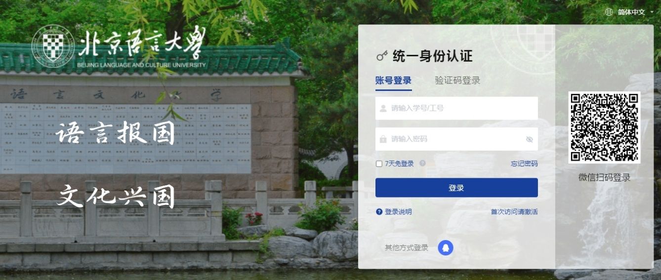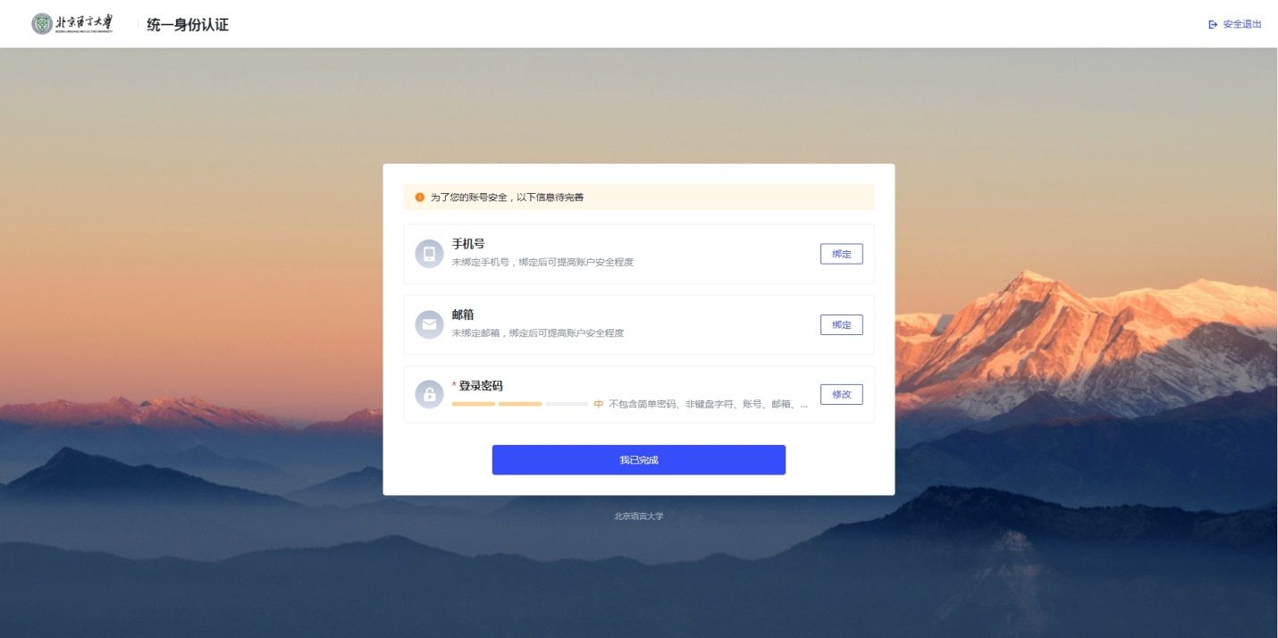 步骤三:点击后跳转至“北京语言大学统一身份认证”,再次输入账户密码登录,需完善资料,修改登录密码。建议绑定手机号或邮箱,以便密码找回。