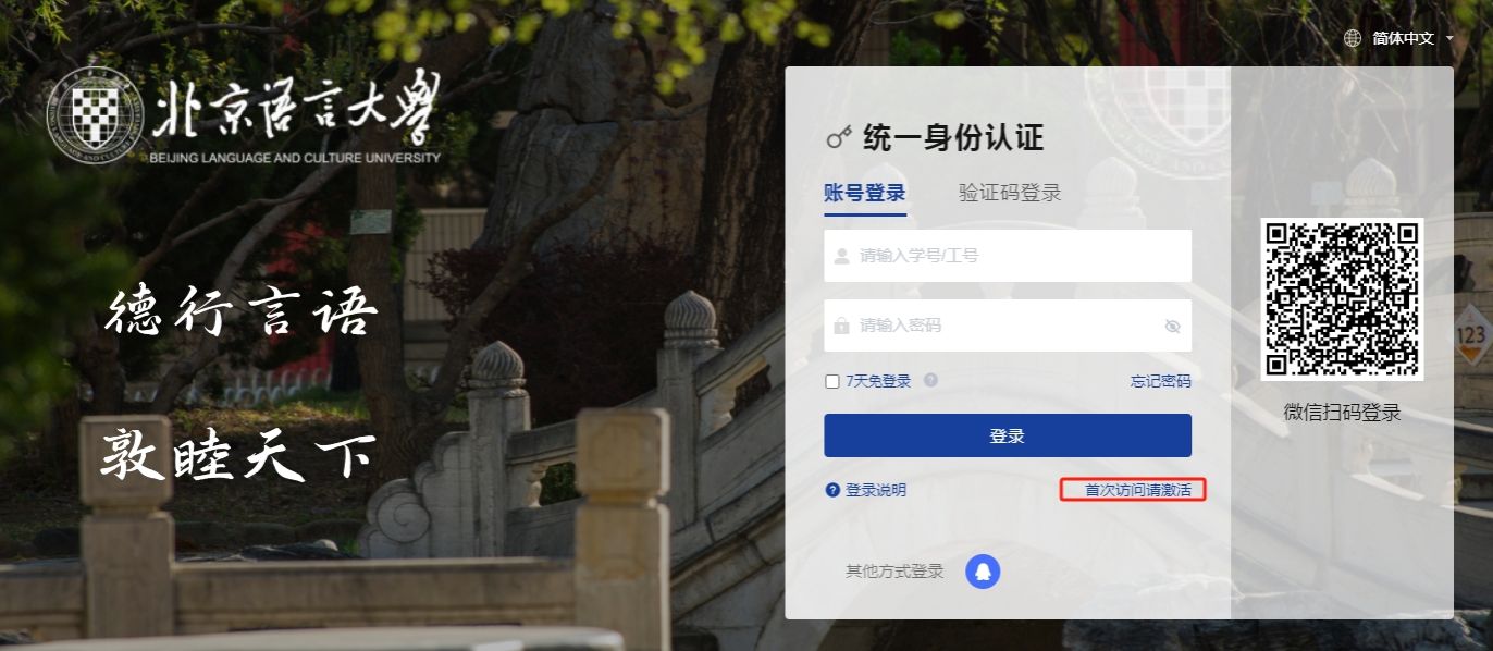 如出现“用户不存在或密码有误”,请登录https://authserver.blcu.edu.cn/,点击“首次访问请激活”进行账号激活,完成激活后重新操作“步骤一”。