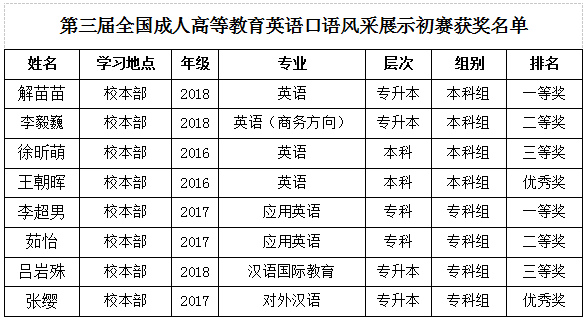 附:第三届全国成人高等教育英语口语风采展示初赛获奖名单