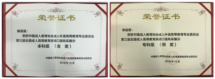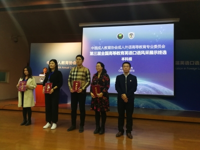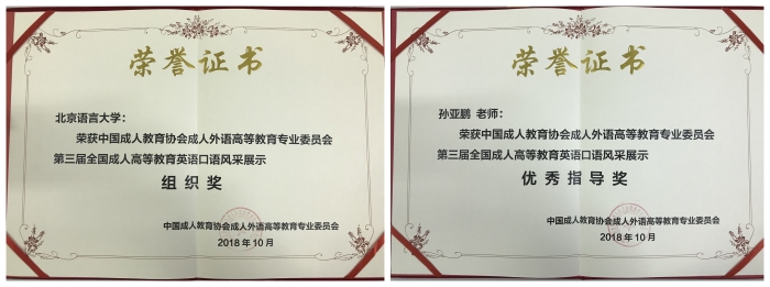2018年10月27日,由中国成人教育协会成人外语高等教育专业委员会主办,面向全国高校成人高等学历教育在籍学生的“第三届全国成人高等教育英语口语风采展示”终选活动在北京外研社国际会议中心隆重举行。经过激烈角逐,我校学生取得了优异成绩,解苗苗同学获得本科组金奖,李超男同学获得专科组铜奖,孙亚鹏老师获得优秀指导奖,北京语言大学还荣获组织奖。本届大赛分英语专业本科、专科两个组别,参加比赛的院校有北京外国语大学、北京第二外国语学院、大连外国语大学、上海外国语大学、四川外国语大学、西安外国语大学、广东外语外贸大学等全国21所外语类及其它高校。