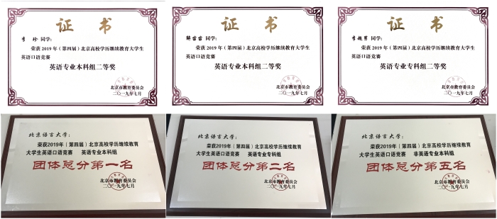 日前,由北京市教育委员会主办的2019年(第四届)北京高校学历继续教育大学生英语口语竞赛在对外经济贸易大学落下帷幕。此次竞赛分为初赛、决赛两个阶段,在京的50余所高校共计230名选手参与比赛。在本次竞赛中我院2018级英语(商务方向)专业专升本李珍、2018级英语专业专升本解苗苗两位同学获得英语专业本科组二等奖,2017级英语专业专科李超男同学获得英语专业专科组二等奖,2018级英语专业专升本刘婧伊获得英语专业本科组优秀奖,2019级汉语国际教育专业专升本王洋、苏清南、2018级汉语国际教育专业专升本吕岩殊三位同学获得非英语专业本科组优秀奖,孙亚鹏、柳明明老师被评为“优秀指导教师”。本校在本次竞赛中获得英语专业本科组团体总分第一名、英语专业专科组团体总分第二名、以及非英语专业本科组团体总分第五名的好成绩。